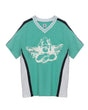 Designed for comfort and style, this green thermal short sleeve jersey features bold white and black paneling and a textured white chenille cherub embroidered on the front for a standout finish.