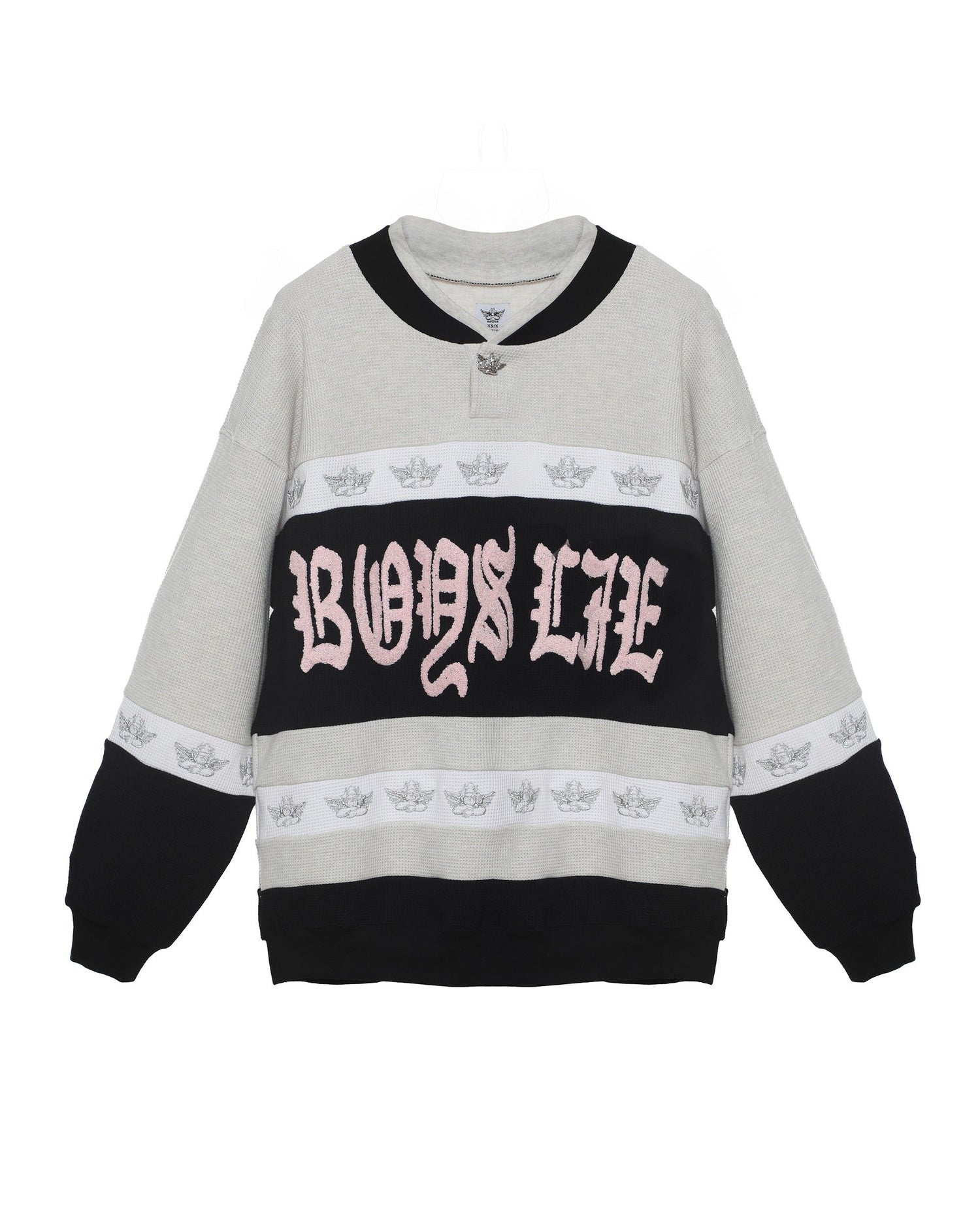 This grey and black paneled crewneck delivers a bold, street-ready vibe with its contrast design and cozy thermal texture. The front is finished with plush pink chenille Boys Lie embroidery, adding a soft yet striking touch to this statement piece.
